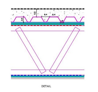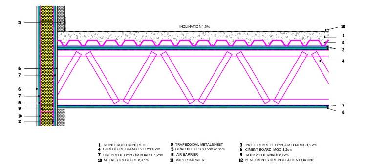 On top of the metal frame, trapezoidal sheet, as a support to 6 cm concrete. The sheet itself has a 0,3 mm thickness, and can withstand a load of 450 kg/m2.