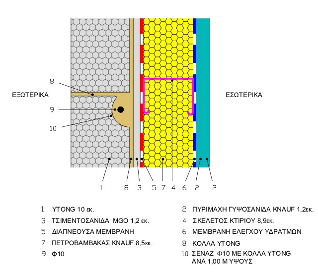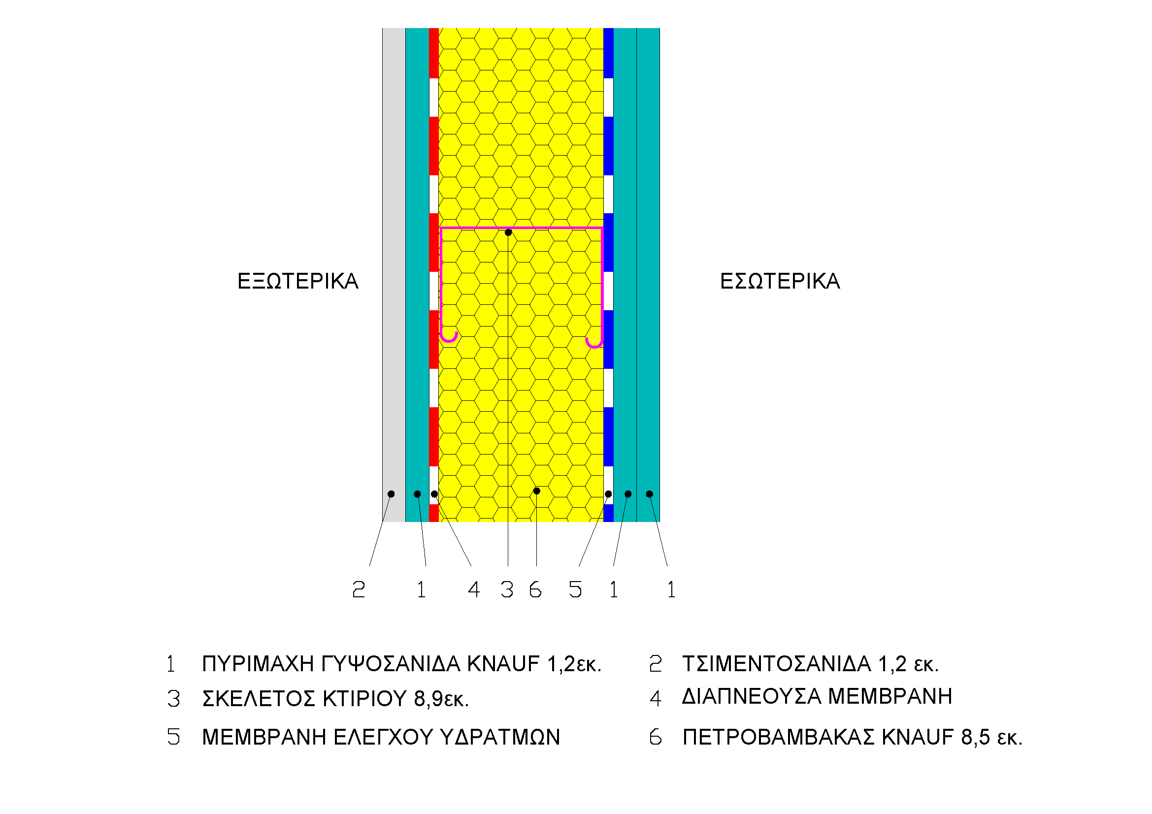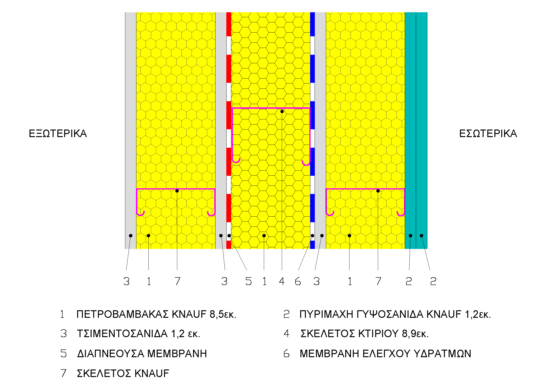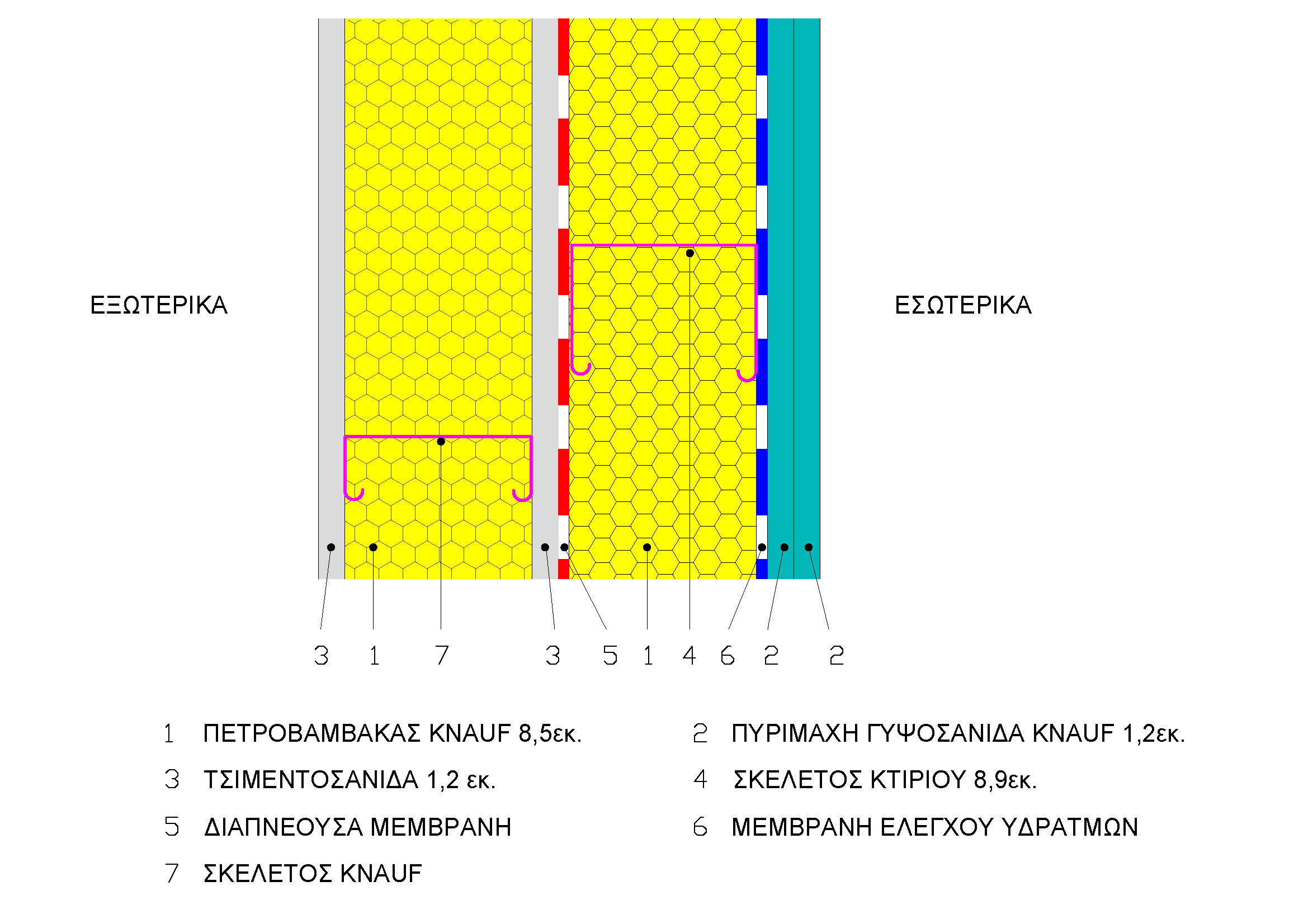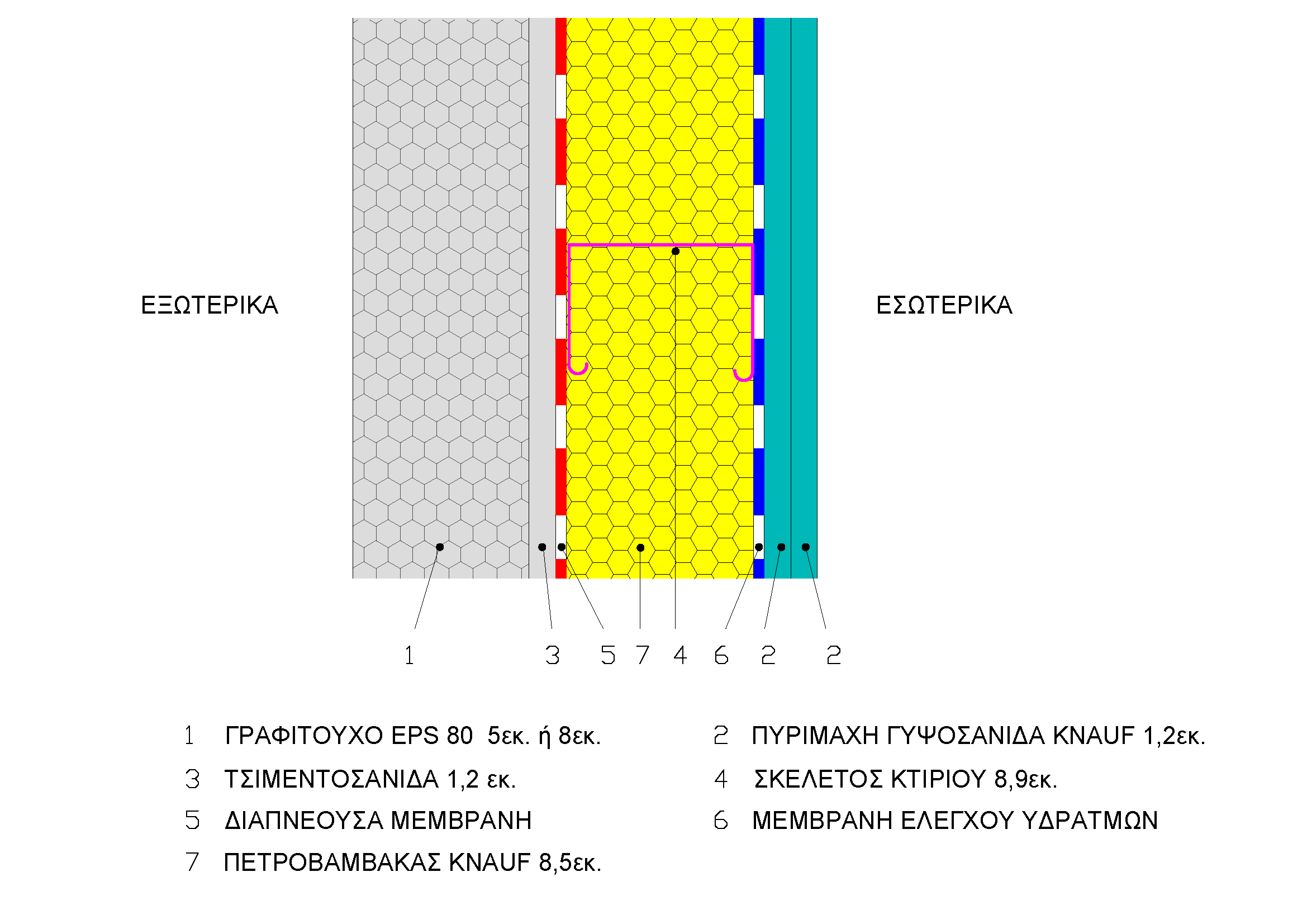 Σύμφωνα με τον ΚΕΝΑΚ του 2020, έχουμε την υποχρέωση να τηρήσουμε ως Συντελεστή Θερμοπερατότητας U = 0,40W/m2*Κ. Αυτό το επιτυγχάνουμε ορυκτοβάμβακα 8,5 εκ με συντελεστή λ= 0,032 W/m*K που τοποθετείται στο κενό του μεταλλικού σκελετού. Ο δε μεταλλικός σκελετός καλύπτεται στο εξωτερικό του μέρος με μία τσιμεντοσανίδα σύν μία πυρίμαχη γυψοσανίδα σύν παστώδη σοβά KNAUF. Στο δε εσωτερικό του με δύο πυρίμαχες γυψοσανίδες. Επιτυγχάνουμε :