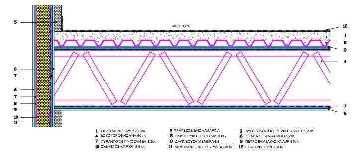 Επί του μεταλλικού σκελετού, θα τοποθετηθεί αυλακωτή λαμαρίνα ως υπόστρωμα στο μπετόν, πάχους 0,3 χλστ, φέρουσας ικανότητας 450 κιλών/μ2.